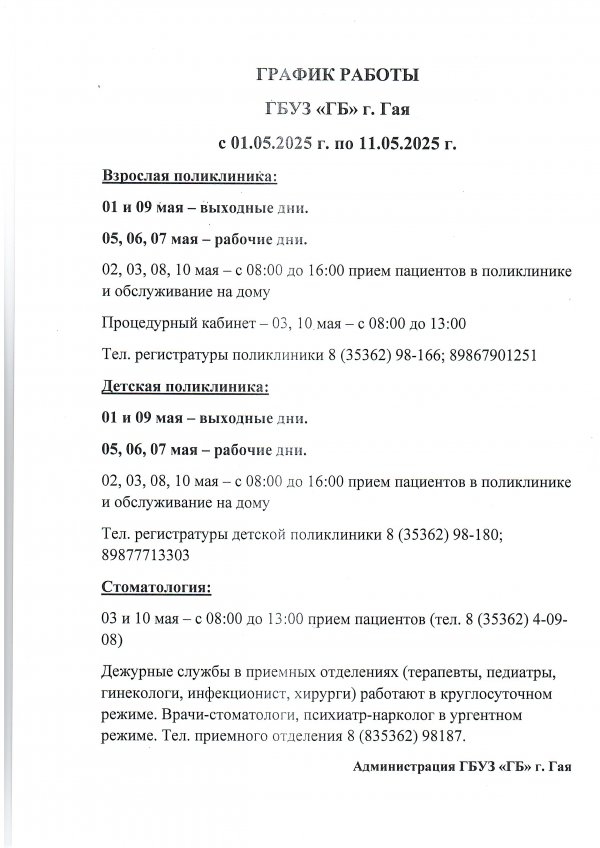 Городская больница Гая опубликовала график работы в период майских праздников, чтобы жители города могли своевременно получить необходимую медицинскую помощь.